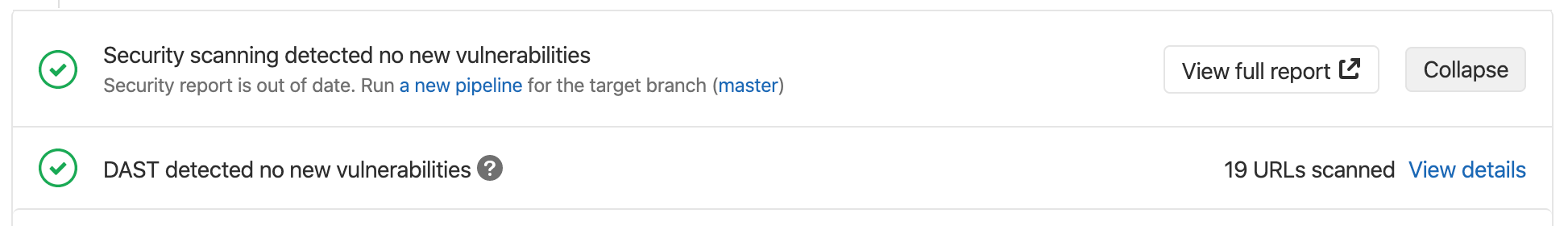 When DAST completes scanning, the merge request page states the number of URLs scanned. Click View details to view the web console output which includes the list of scanned URLs.