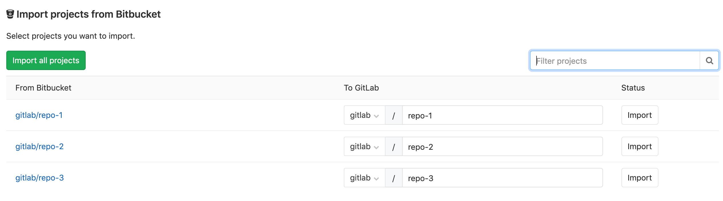 Click on the projects that you'd like to import or Import all projects. You can also filter projects by name and select the namespace under which each project will be imported.