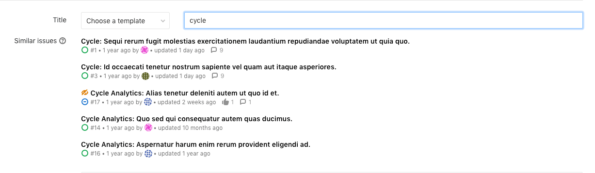 To prevent duplication of issues for the same topic, GitLab searches for similar issues when new issues are being created.
