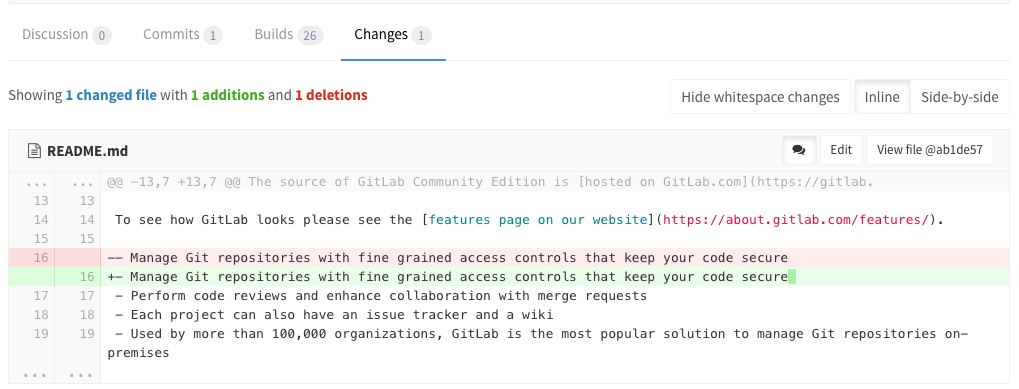 The Changes tab on a merge request, below the main merge request details and next to the discussion tab, shows the changes to files between branches or commits. This view of changes to a file is also known as a diff. By default, the diff view compares the file in the merge request branch and the file in the target branch.
