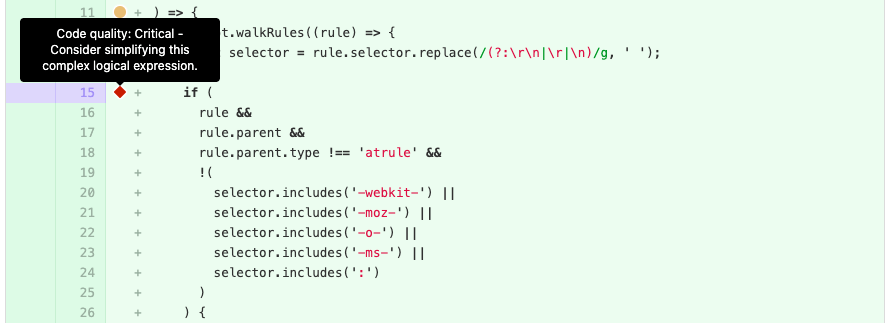 Changes to files in merge requests can cause Code Quality to fall if merged. In these cases, the merge request's diff view displays an indicator next to lines with new Code Quality violations. For example: