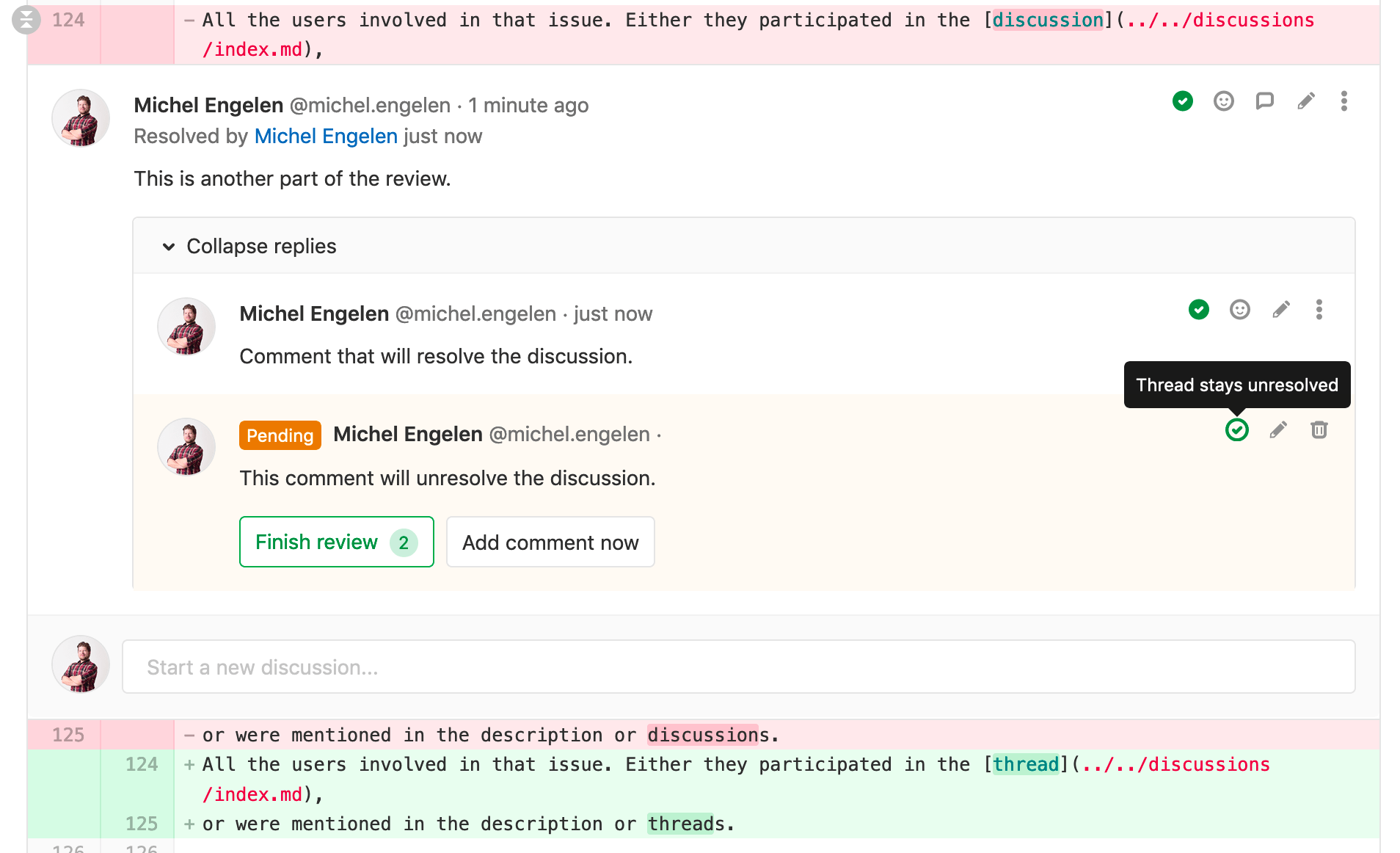 If a particular pending comment resolves or unresolves the thread, this is shown on the pending comment itself.
