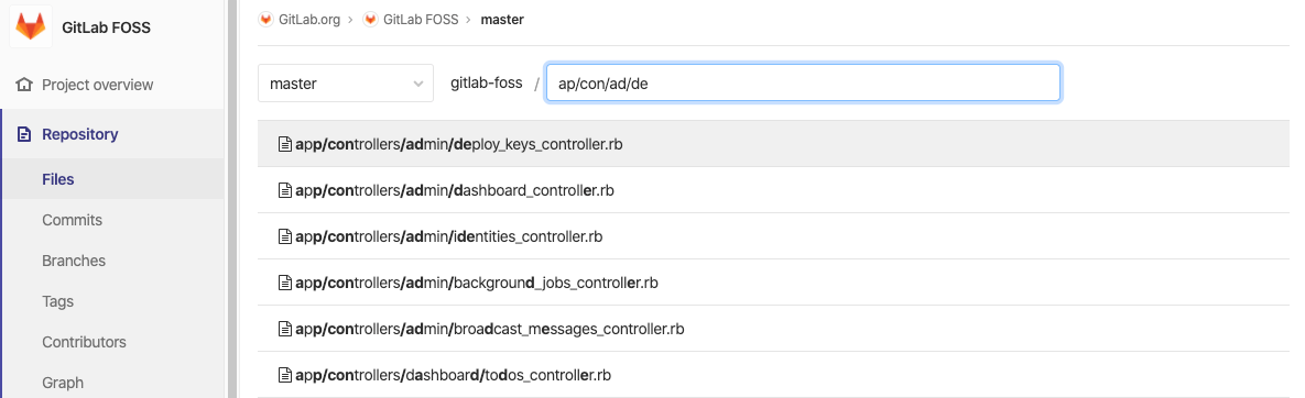 For example, consider the GitLab FOSS repository and that we want to open the app/controllers/admin/deploy_keys_controller.rb file.