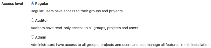 Access levels are different than roles or permissions. When you create a user, you choose an access level: Regular, Auditor, or Admin.