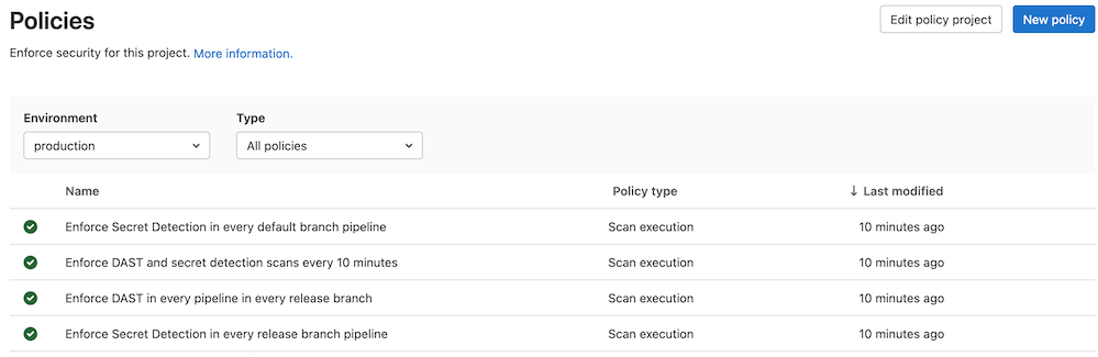 Policies in GitLab provide security teams a way to require scans of their choice to be run whenever a project pipeline runs according to the configuration specified. Security teams can therefore be confident that the scans they set up have not been changed, altered, or disabled. You can access these by navigating to your project's Security & Compliance > Policies page.