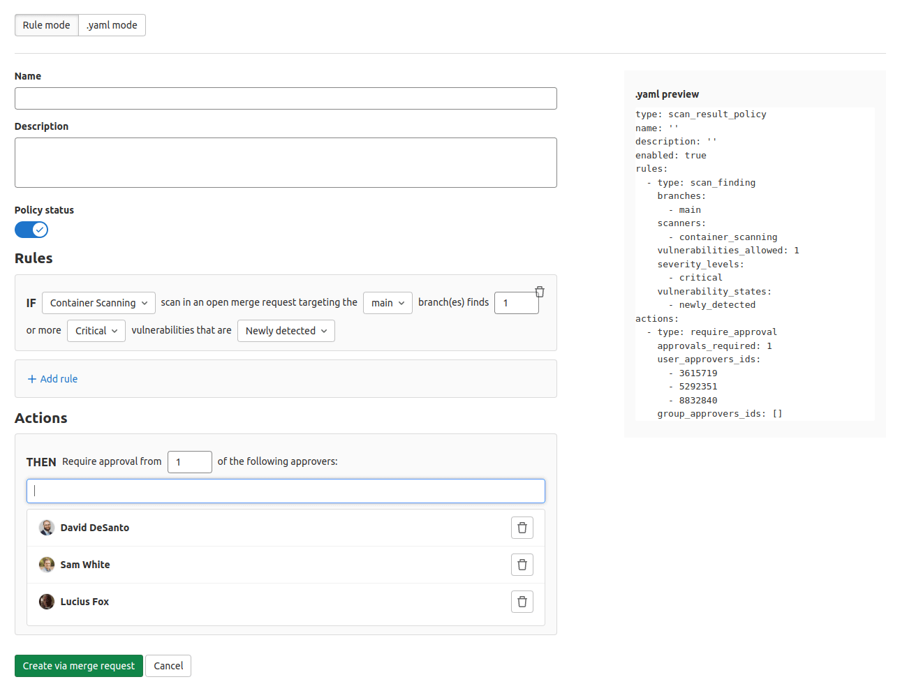 When you finish creating or editing your policy, save and apply it by selecting the Configure with a merge request button and then merging the resulting merge request. When you press this button, the policy YAML is validated and any resulting errors are displayed. Additionally, if you are a project owner and a security policy project has not been previously associated with this project, then a new project is created and associated automatically at the same time that the first policy merge request is created.