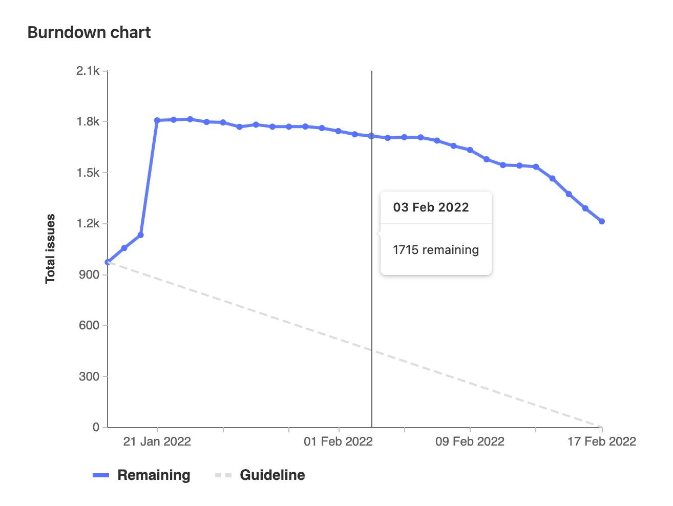 Fixed burndown charts track the full history of milestone activity, from its creation until the milestone expires. After the milestone due date passes, issues removed from the milestone no longer affect the chart.