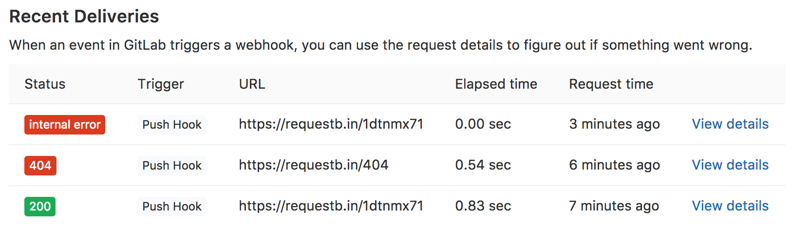 NOTE: This history is unavailable for Group-level webhooks. For more information, read issue #325642.